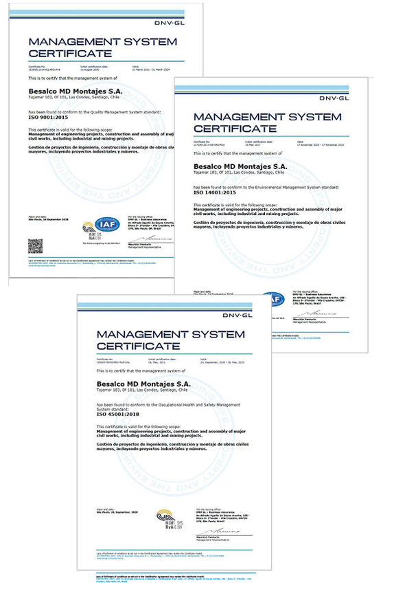 El compromiso con la calidad y la mejora continua se ve reflejado en la certificación de nuestros Sistemas de Gestión bajo estándares internacionales: ISO 9001:2015 (Calidad), ISO 14001:2015 (Medio Ambiente) y ISO 45001:2018 (Seguridad y Salud Ocupacional). Estos sistemas nos permiten estructurar, planificar y optimizar cada fase de nuestros procesos, garantizando eficiencia, cumplimiento normativo y confianza para nuestros clientes. Con esta base, consolidamos nuestra posición como un socio estratégico clave para la gran minería, asegurando resultados de alto nivel en cada uno de nuestros proyectos.